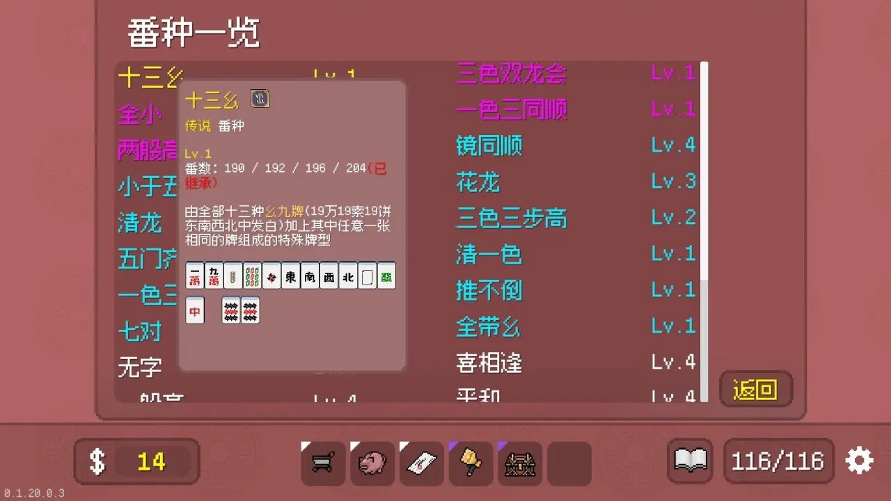 當然,就像《小丑牌》不需要了解德州依然可以輕鬆上手,在《青天井》裏,即便你是麻將白癡,只要你能記住「番種名」就能大殺特殺——實在記不住也沒關係,無腦做清一色就是了!好比小丑牌低注時,同花這類大牌型仍舊是萌新們的“通關密碼”。況且遊戲裏有細緻到像素級的番種手把手教學,我奶奶來了都會打。