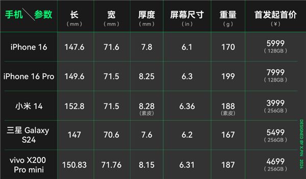 咱們先拋開名字,對比一下 X200 Pro mini 的尺寸,其實它的大致體型,就是跟 iPhone 16、 iPhone 16 Pro、小米 14 和三星 Galaxy S24 這幾位差不多。
