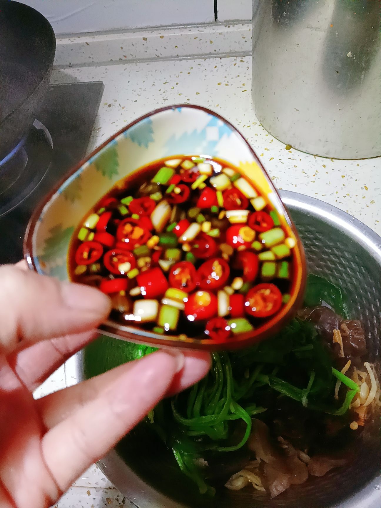 2勺生抽➕1勺陳醋➕半勺蠔油➕適量溫水攪拌均勻。這個料,根據自己口味調。