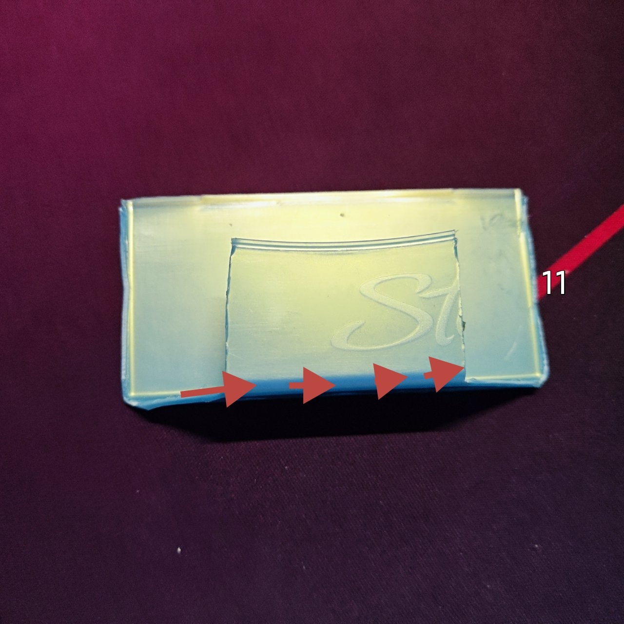 第四步:這步建議加熱盒子,比較好弄,如圖十加熱紅線盒底,然後慢慢往下掰,掰到圖九樣子之後就可以用刀把右邊一小塊割下來了。(注意安全)左邊同理。