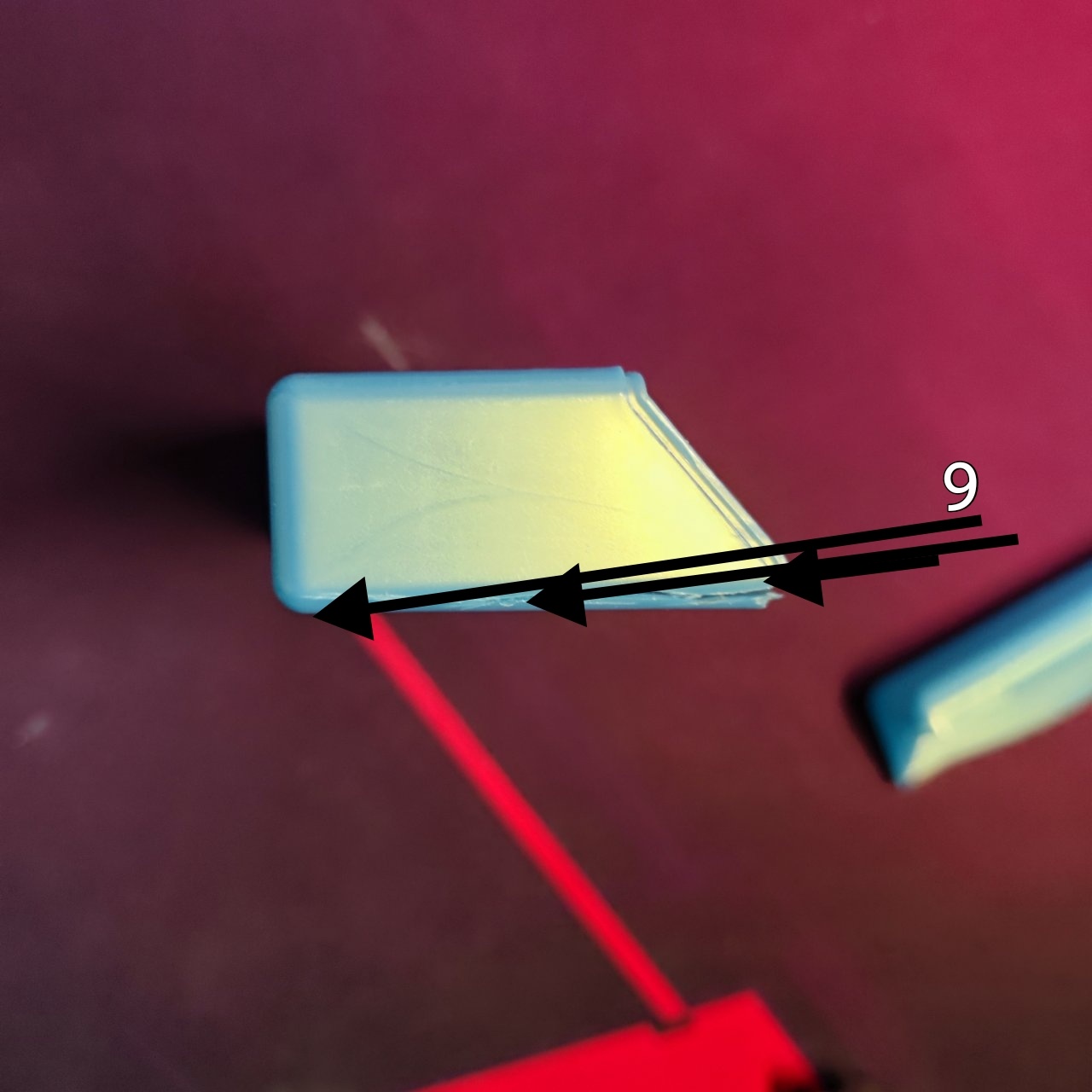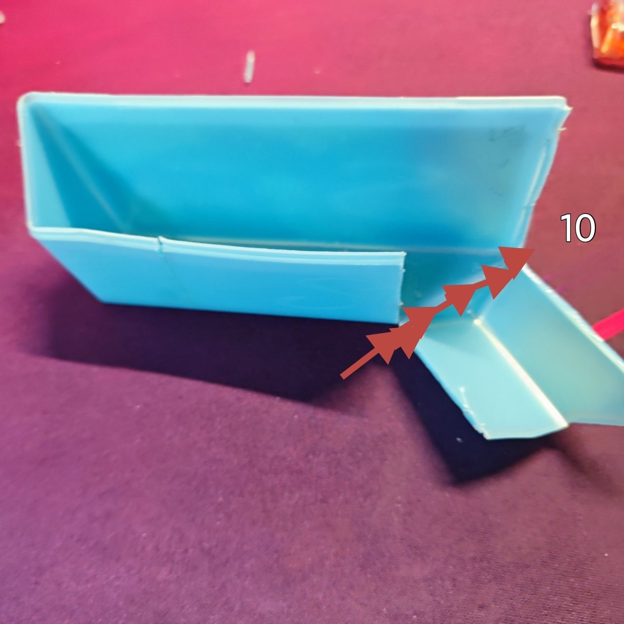 第五步:加熱盒子短的邊緣處(即圖十一箭頭指示邊緣)將掰彎如圖十三。也可在白色箭頭處塗一點熱熔膠增加摩擦力。