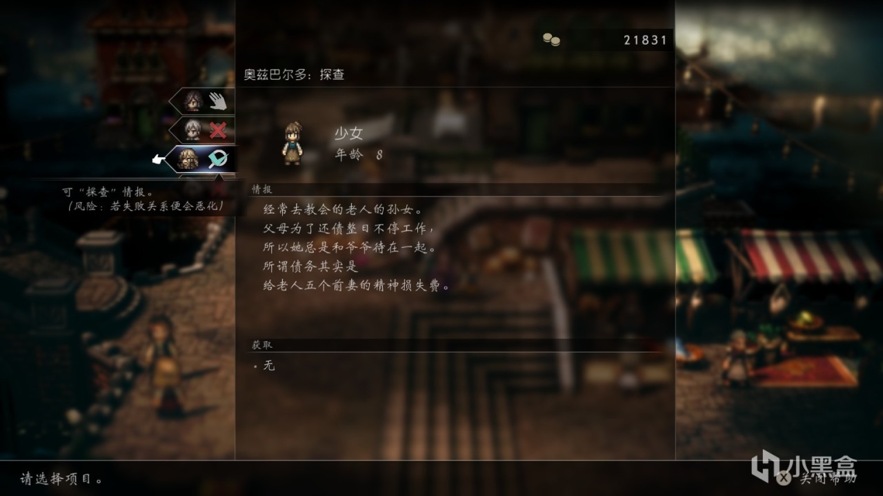 而除了這些直接構成或者輔助任務內容的信息,其他的角色,哪怕只是一個沒有名字的路人,製作組也嘗試了應用這些信息去完成角色的故事設定——比如帶着麪包去救濟窮人的富家小姐,不知道她的食物已經被心狠的父親下了毒藥;路邊的小女孩,父母辛苦賺錢只是爲了支付爺爺多位前妻的贍養費等等。
