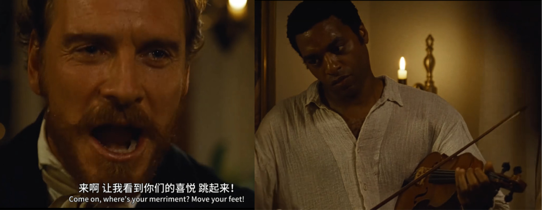 另一個鏡頭髮生在男主被轉賣給一個心理有問題的奴隸主後——勞作了一天的奴隸們半夜被拉起來陪着唱歌跳舞,全程就奴隸主一個人最High,第二天還是照常開工採棉花。