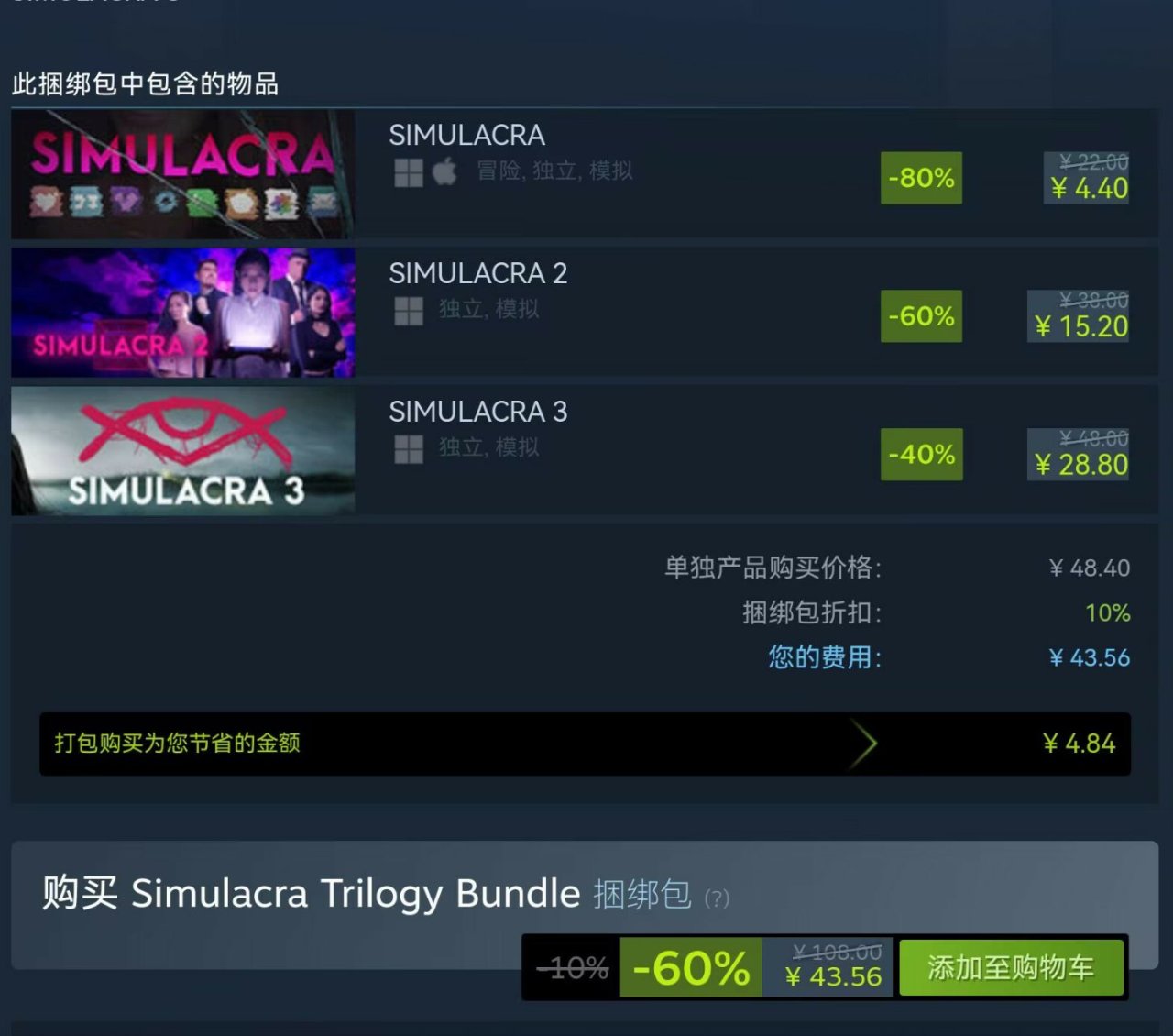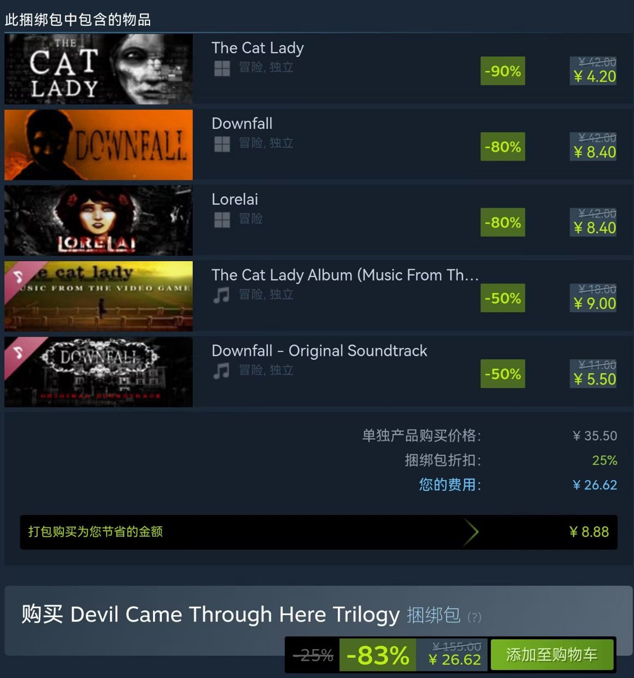 好幾年前玩過他家的尋找自我和locked up,都是步行模擬。現在他們家遊戲有幾款打折均價個位數,我覺得這個價格稍微試一下膽子還是挺合適的,捆綁包更加實惠,不過我還是提一下,之前玩過那兩部個人感覺並不太嚇人流程也不長。