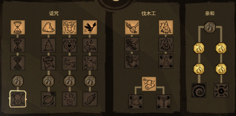 第二列,第一,二,三個技能分別是海狸人1,2,3級。一級是採礦效率提升至125%,二級是砍伐效率提升至720%,三級能開採和破壞堅硬的材料,大理石柱和裂隙晶體,啃咬開裂的柱子。
