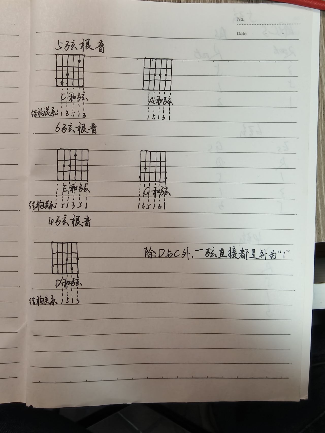 “CAGED系統”所指的是在前三品中“大三和絃”的C和絃、A和絃、G和絃、E和絃與D和絃的按法。其中C與A的和絃“根音”在5弦上,G與E的和絃“根音”在6弦上,D的和絃根音在4弦上。其中頻繁使用的多爲“6弦”與“5弦”根音,因而此次也僅是對6與5弦爲基礎的“指型”做說明。