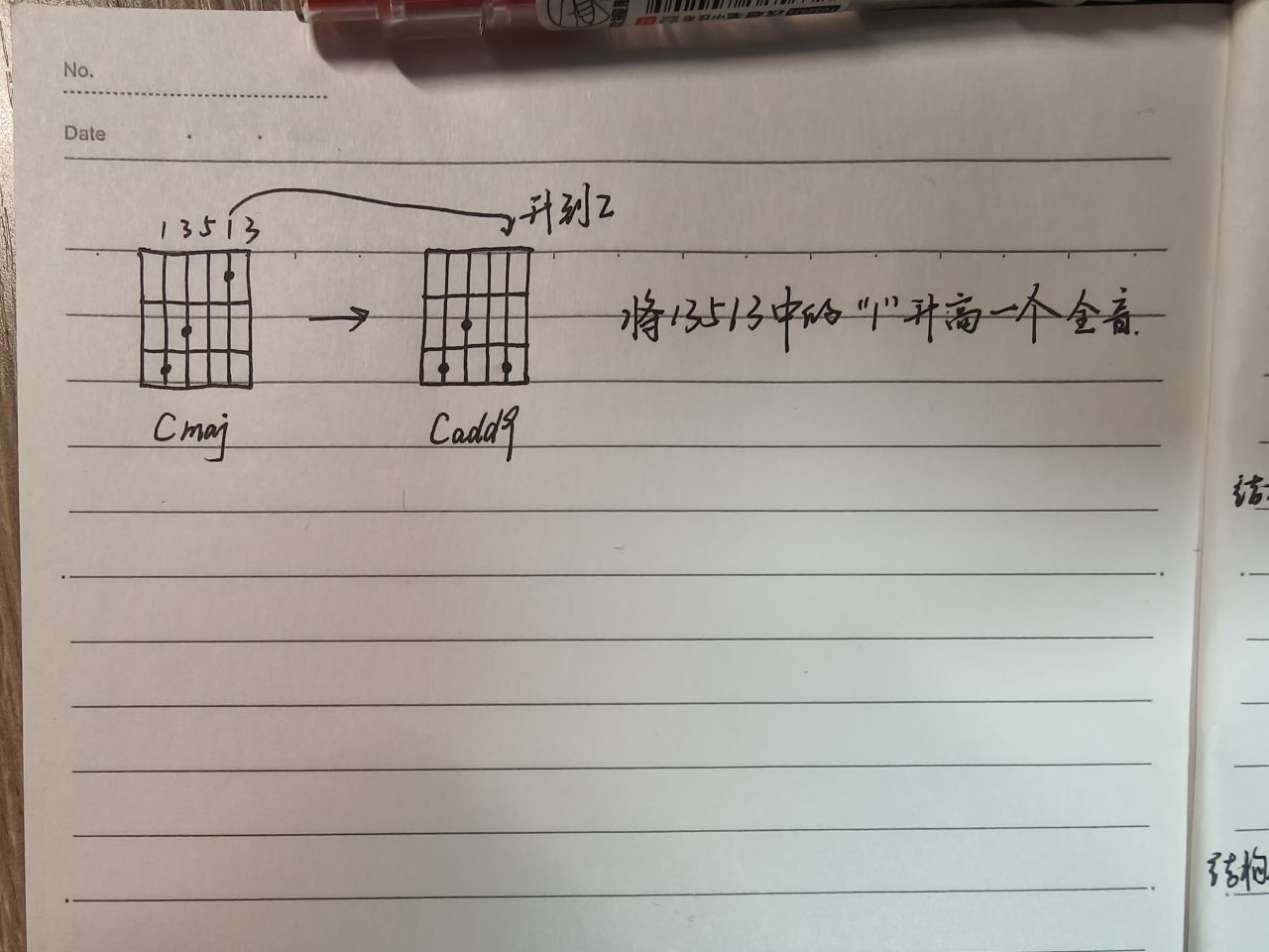 舉例說明:C大三和絃中將二絃上的“1”音升高爲“2”,則得到Cadd9(九和絃)。