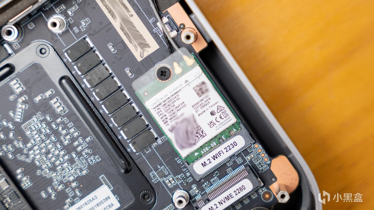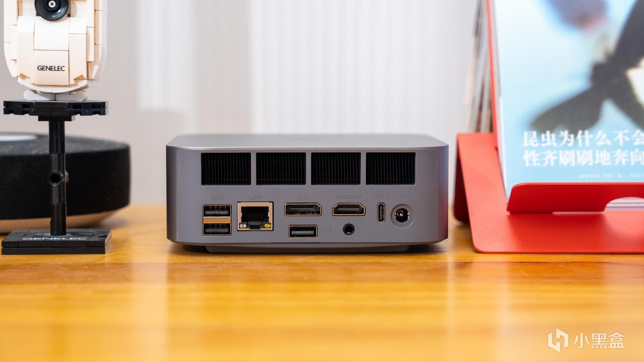機身背後出風口位置採用了塑膠設計,解決了出風口的熱導向機身外殼的問題。內採用主動散熱器,搭載MSC 2.0 散熱系統,配備單渦輪風扇和VC均熱板。當然更多的I/O 接口都集中在機身後部,提供了三個USB-A 接口,一個USB-A 3.2 10Gbps 兩個USB-A 2.0 接口,一個2.5G LAN 有線接口、DP 1.4和HDMI 2.1 視頻輸出接口、USB4 40Gbps Type-C 接口和圓形的DC 電源供電接口。可以說接口配置上非常全面了。