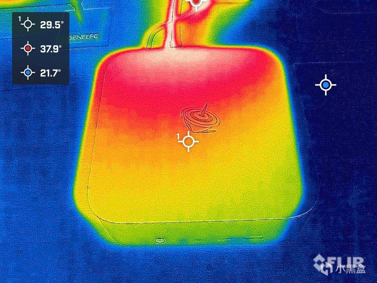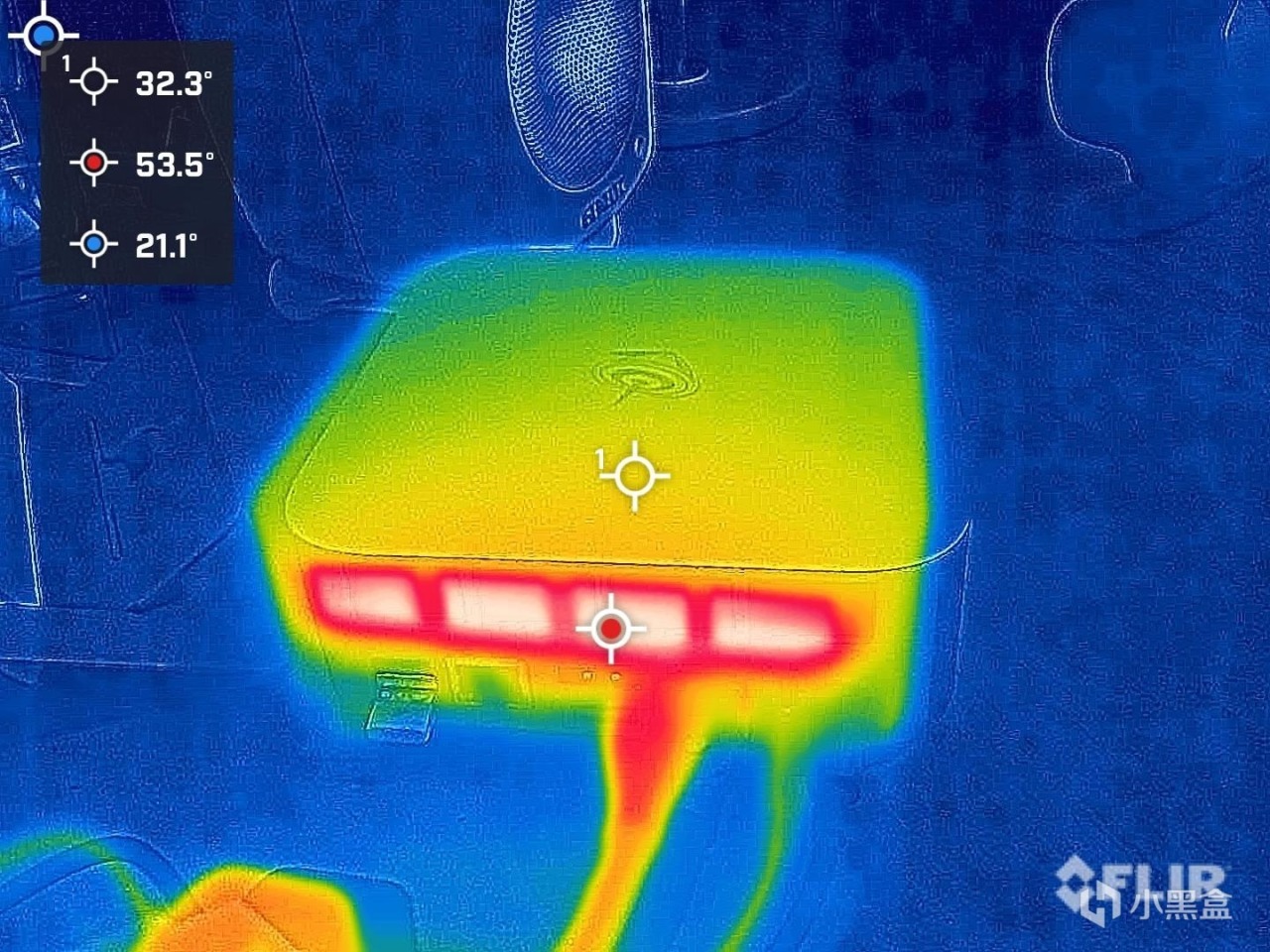 零刻 SER8 發熱情況如圖,發熱位置主要集中在機身後部散熱孔位置。可以看到MSC2.0-VC均熱板+全新的風扇設計在散熱方面確實有不錯的表現,VC均熱板可以很好的將CPU熱量快速均勻的釋放,達到高效散熱的目的。