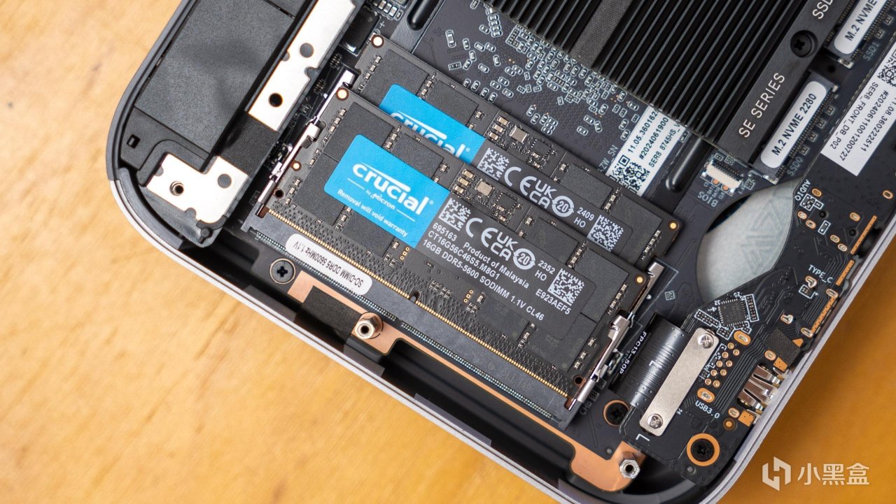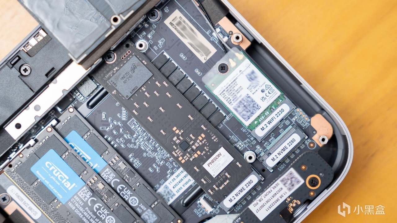 如果你只是有升級內存、SSD的需求的話,零刻 SER8 基本沒有什麼拆機難度。打開後就可以看到內部的雙DDR5 筆記本內存和M.2 硬盤的安裝位置。當然最「卷」的還是零刻,爲玩家提供了碩大的M.2 散熱盔甲來幫助散熱。這點上真的「卷」。