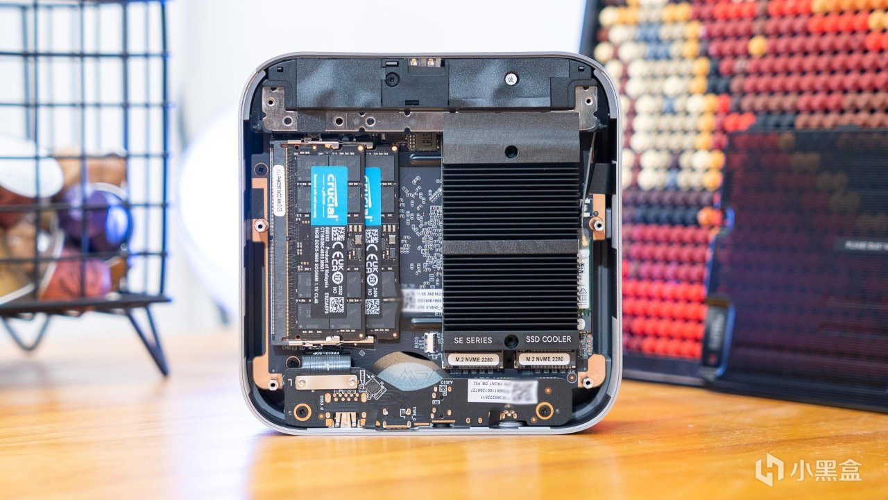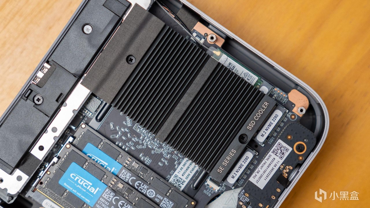 零刻也是真的內卷,在SSD硬盤位置上方還有一個碩大的雙M.2 SSD散熱盔甲來幫助硬盤散熱。零刻SER 8是支持PCIe 4.0的,零刻的這樣的固態散熱配置可以更好的保證系統運行的穩定。