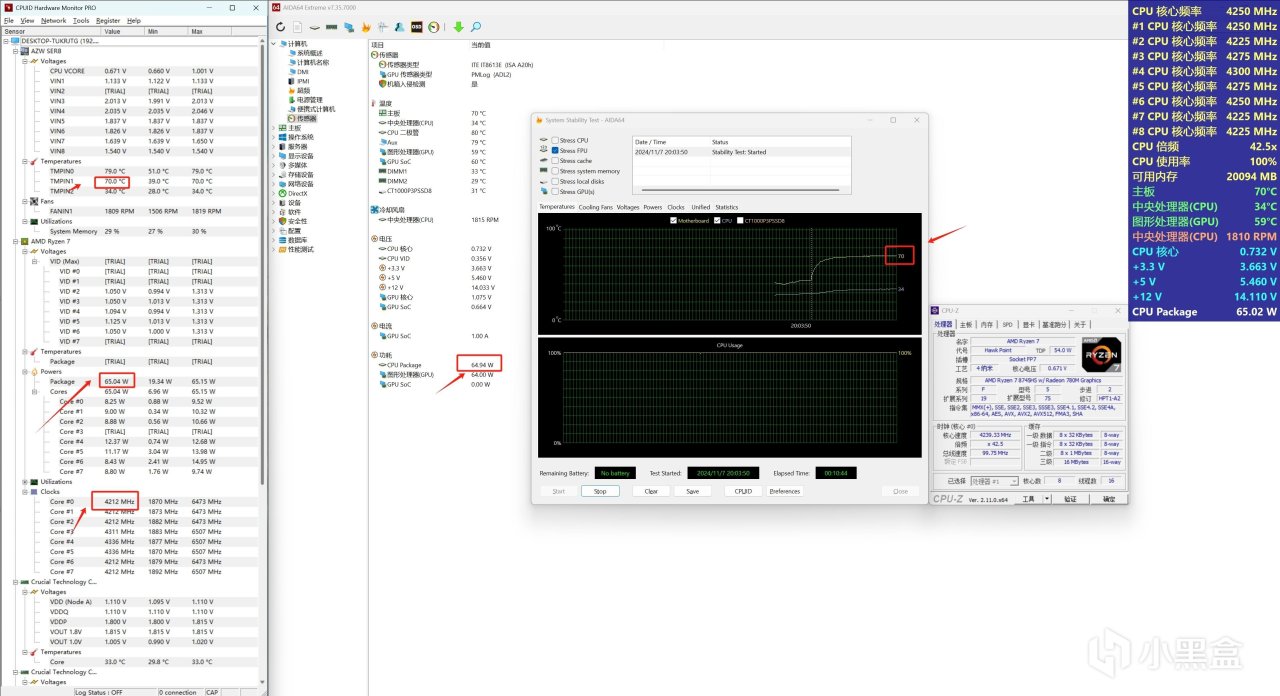 在bios中切換爲Performance Mode的65W性能模式後,AIDA 64 FPU單烤測試十分鐘後。8745HS處理器功耗穩定在65W,處理器溫度不過70℃。處理器核心頻率4.25GHz。