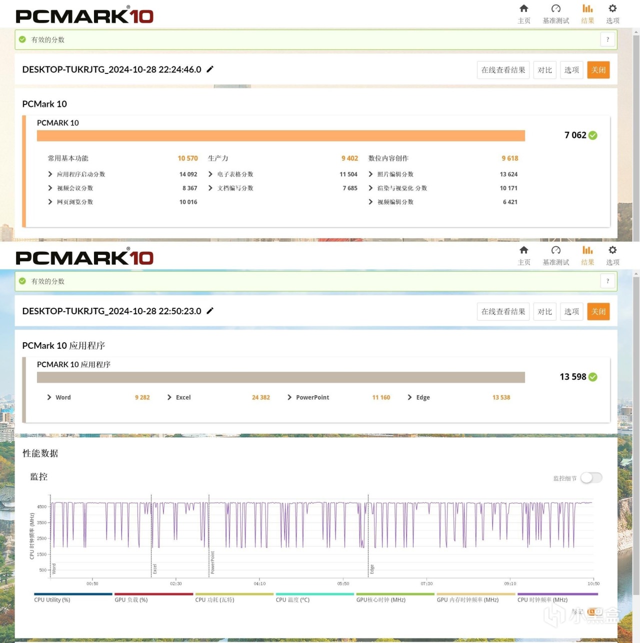 PCMark 10的Office 辦公軟件測試中得分13598,Word 9282,Excel 24382,PowerPoint 11160,Edge 13538;