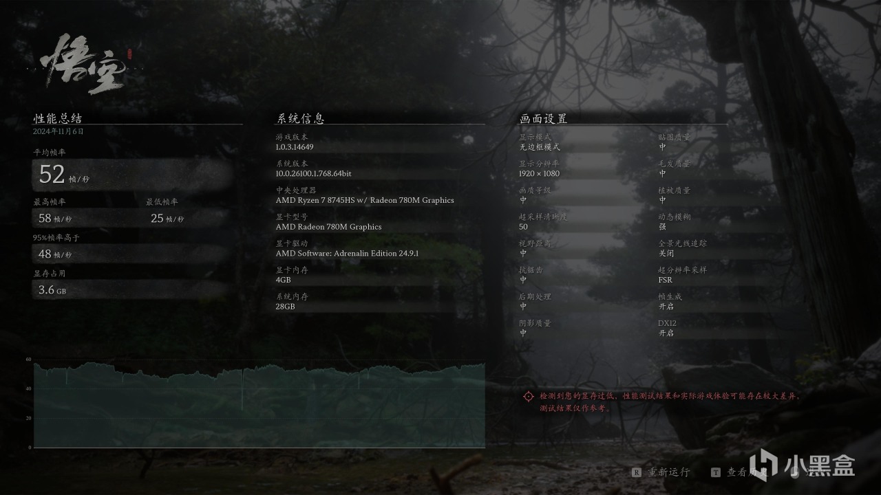遊戲測試方面測試了一款最近還有些熱度的遊戲「黑神話悟空」,實測在1080P分辨率下中等畫質,未開啓光追的情況下。超級採樣率50的時候遊戲平均幀數爲52幀,最低幀數25幀。如果你想體驗這款遊戲的話,降低畫質還是可以玩耍一下的。