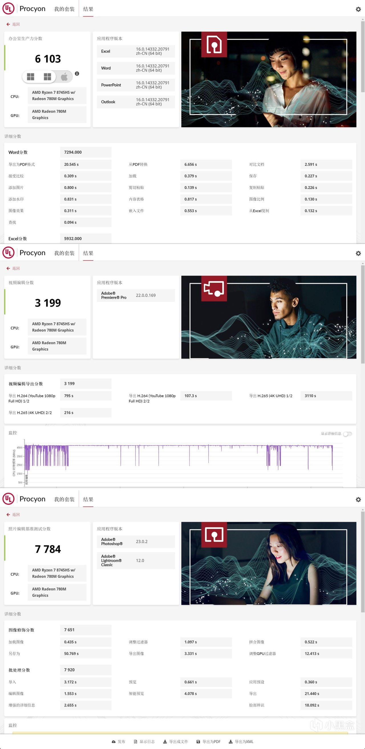 「Procyon 的視頻編輯場景測試」中在 Adobe Premiere Pro 視頻編輯導出分數爲 3199分。「Procyon 的照片編輯場景測試」中在 Adobe Photoshop 照片編輯導出分數爲 7784分。