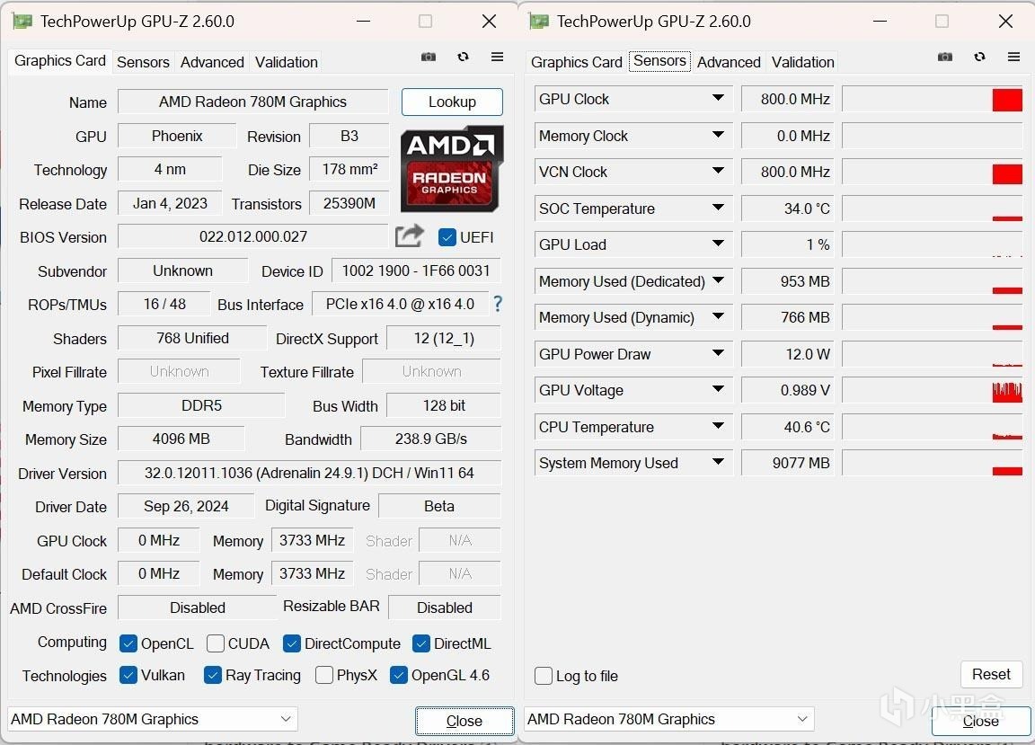 核顯性能部分,AMD 可以說是給玩家一次拉滿的享受。AMD 銳龍7 8845HS 處理器給玩家帶來的是RDNA3架構設計的AMD Radeon 780M 核顯的配置,提供了4GB 顯存以及最高可達2700MHz頻率支持。