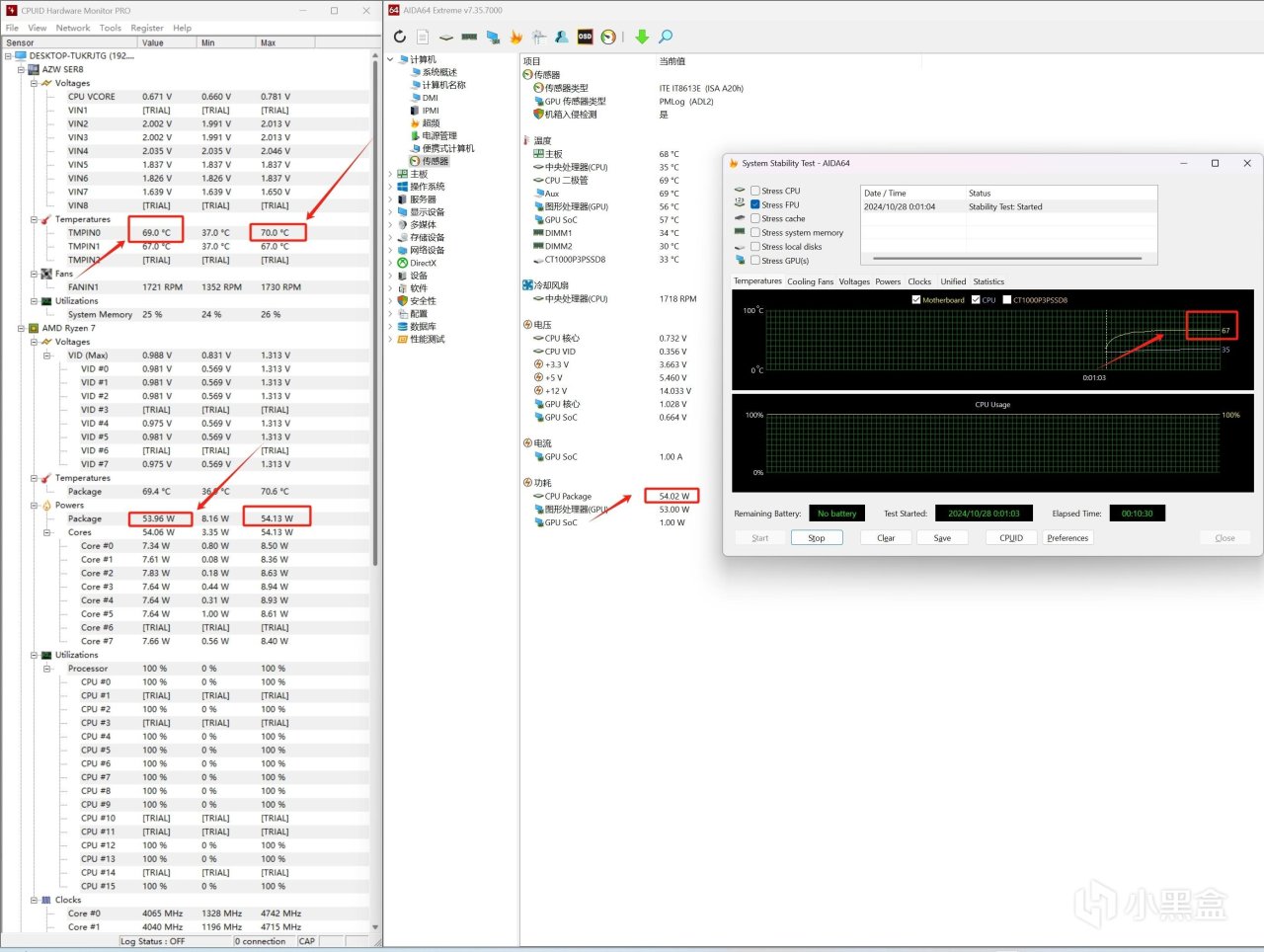 壓力測試方面首先默認功耗54W的情況下作AIDA 64 FPU 處理器單烤測試,十五分鐘後可以看到8745HS處理器功耗穩定在54W,處理器溫度不過69℃。