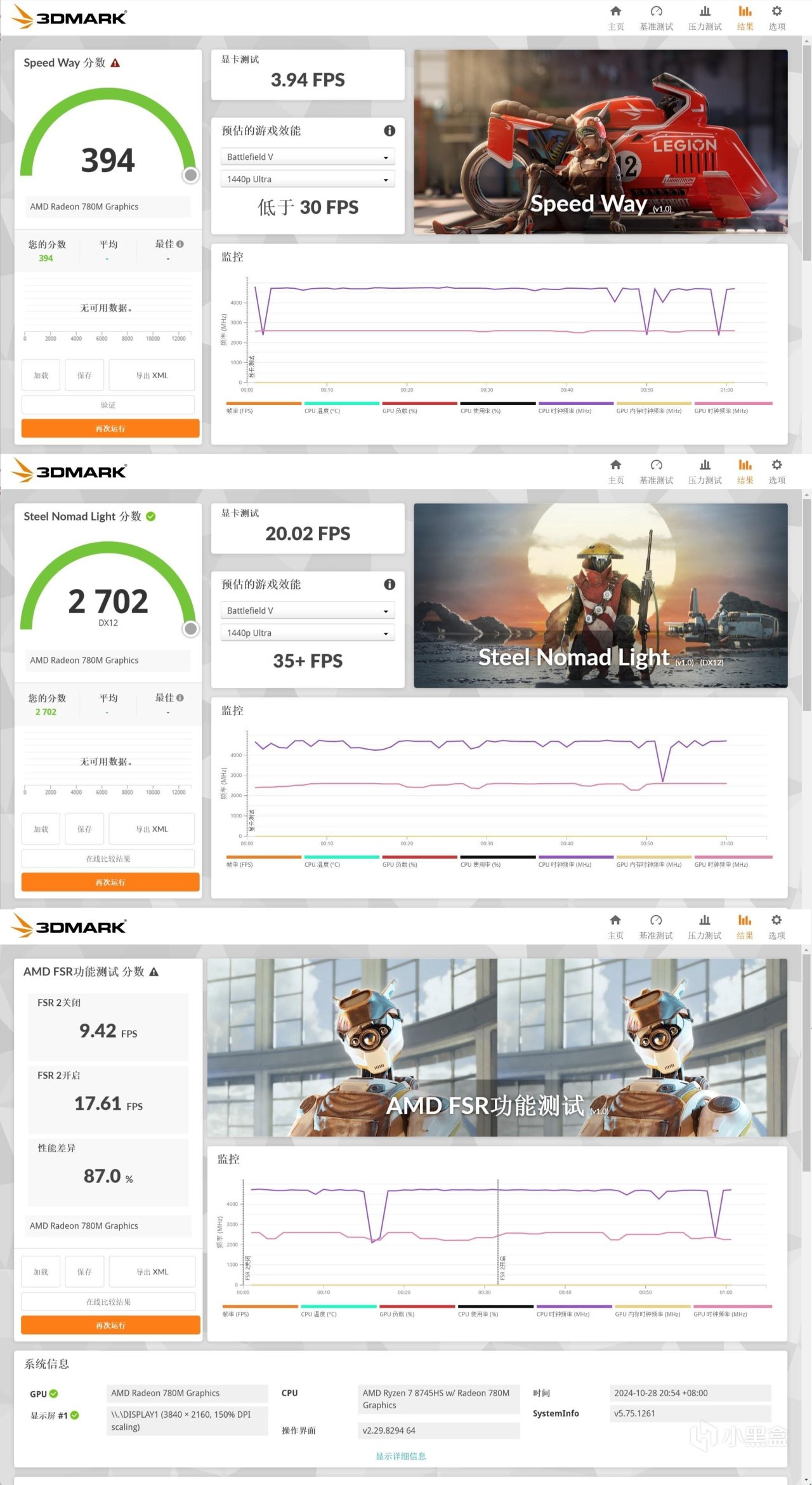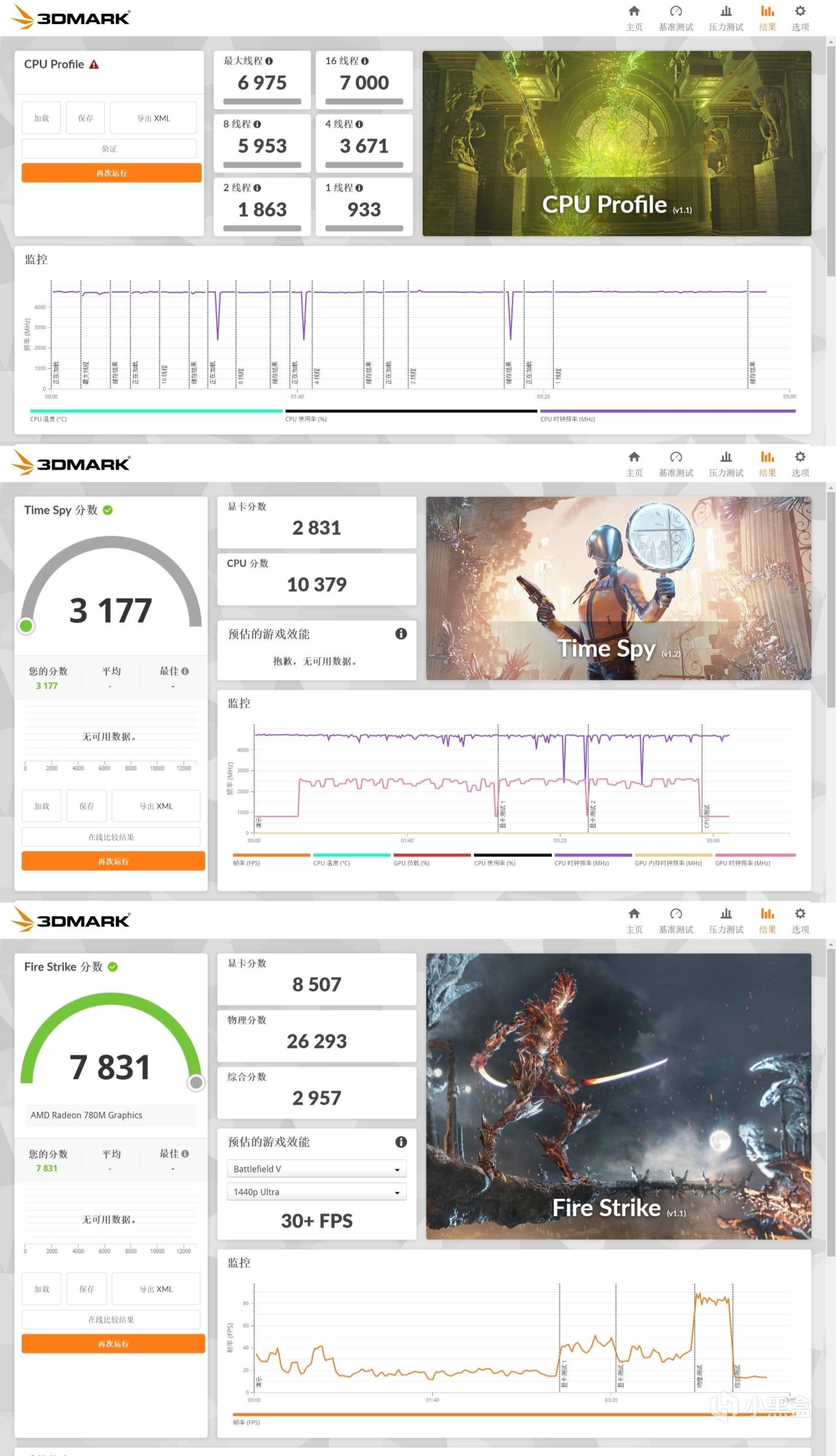 通過3DMARK 測試可以看到780M 核顯在光追等測試下成績都十分不錯。