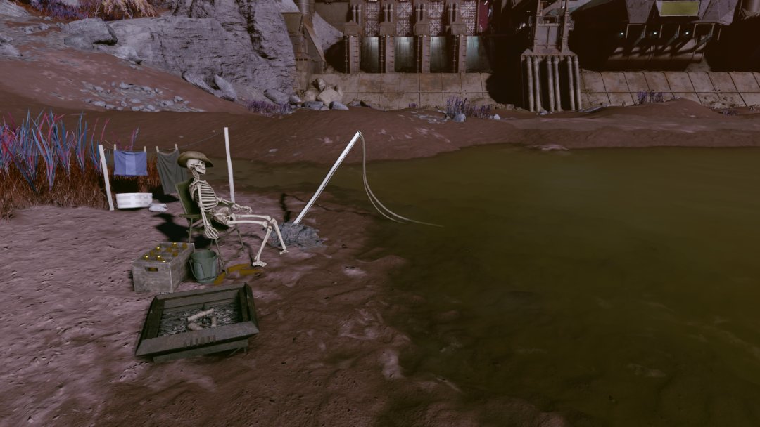 主線大壩邊上這個釣魚佬的骨架,着實讓人想起了很多《輻射》中的有趣佈置