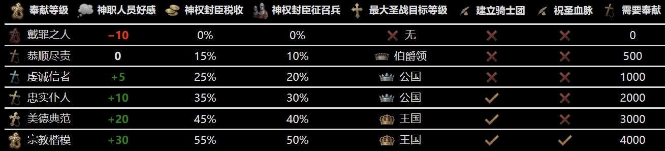 積累虔誠能夠提升奉獻等級,極大提高神職人員的好感度和神權制封臣的賦稅和徵召兵