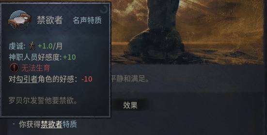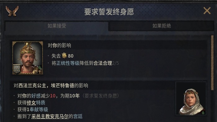 天主教角色能夠讓自己繼承人誓發終身願成爲神職人員,代價相對較小,但是成功的概率較低,需要配合牽制使用