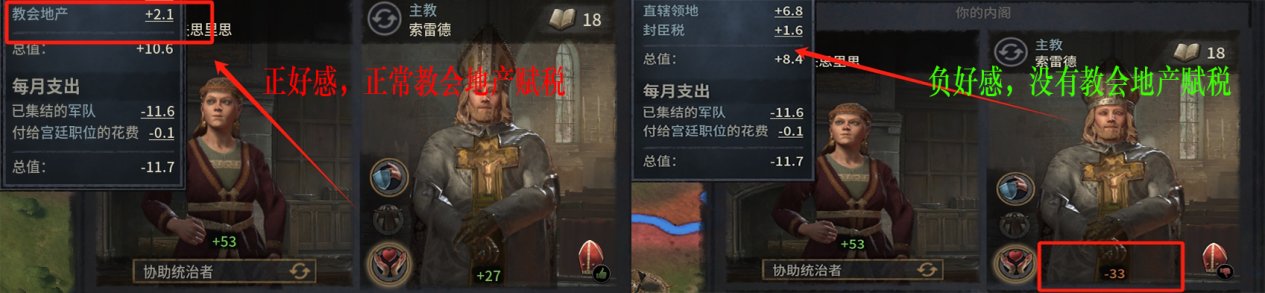 教會地產比較特殊,你的領地祭司會承租你直轄領地下的教會地產,並且根據對你的好感繳納賦稅,特別關注和祭司的好感度,好感度爲負,是沒有賦稅的,而100的好感度可以拉滿教會地產的賦稅(記得搞好關係哦!)