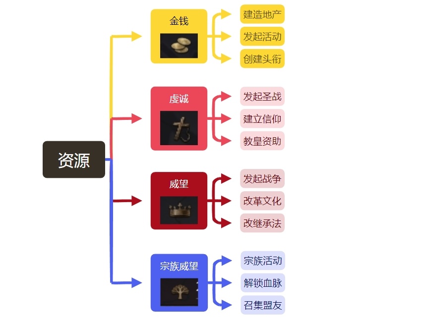 我們的角色進行活動基本都需要消耗資源,金錢、威望、虔誠、宗族威望這四種資源構成了CK3的基礎資源系統