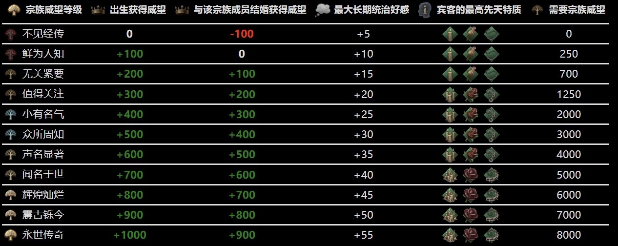 宗族威望的提升能夠解鎖下一等級的宗族威望等級,有利於提高婚姻接受度和賓客先天特質,但由於宗族威望等級積累比較慢,所以需要幾代人的努力才能成就偉大的家族