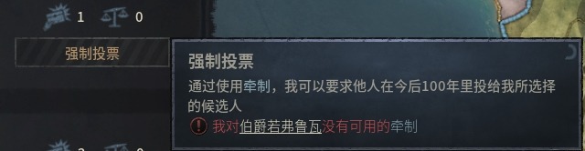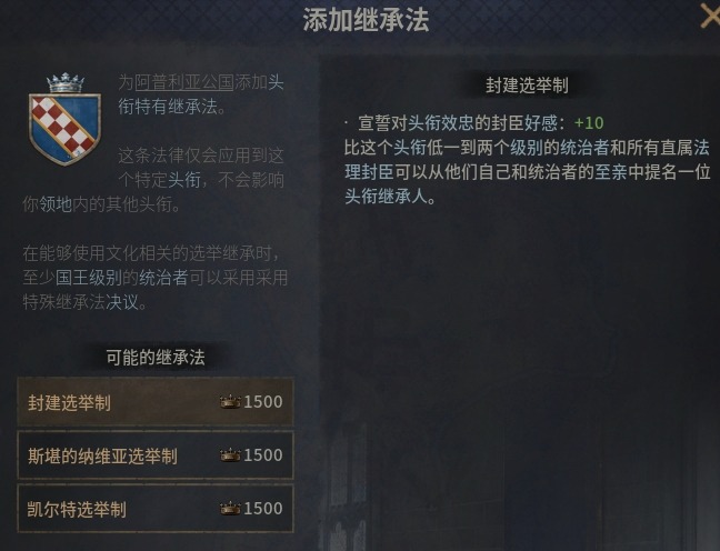 在頭銜添加繼承法的情況下,該頭銜的繼承人將會由封臣投票選出而非在領主的孩子內分割,我們只需爲自己想遊玩的繼承人拉投票即可(可以使用牽制