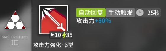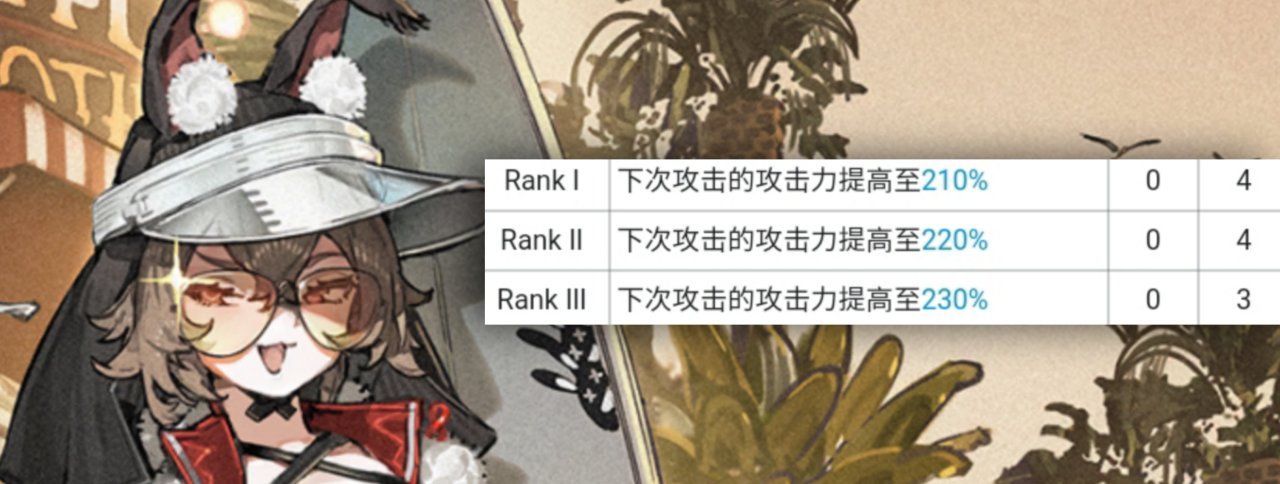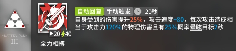 ②技能極快的迴轉也是一大優勢,專三僅15技力!攻擊力提升至752×1.9≈1429,搭配天賦最大傷害≈1600,作爲四星幹員輸出合格了,30秒能打20次,對單32000總傷