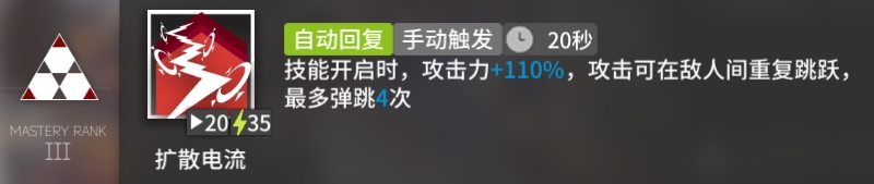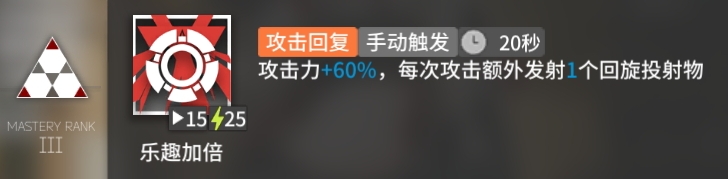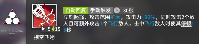②技能期間最多同時打3,有優先對空的隱藏效果,擊中飛行敵人時造成1.5秒停頓,本身就是1.5秒攻速,持續攻擊飛行敵人的話實現穩定停頓,可以模擬速射手+凝滯師了