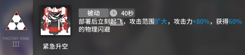 雖然①技能落地就起飛,但是部署的瞬間還是會被攻擊到,遇到霜星的封地板時即便處於起飛狀態也會被強制擊倒,40秒內雲跡還有60%物閃,閃避數值給得很大方
