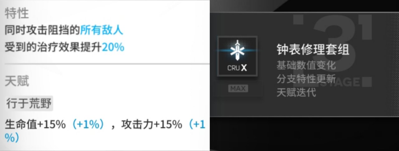 石英x模特性強化生存,使其受到的治療量提升20%,站場能力提升,無模組時就是奶量黑洞,該特性效果也直接減輕了醫療、奶盾等治療類幹員的壓力,和重劍手適配