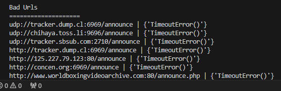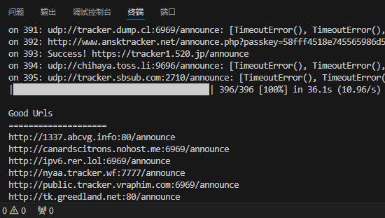 注意:vscode的終端顯示大概在1000行,超過的信息會不顯示,因此需要分批檢測Tracker地址,否則太多檢測不過來