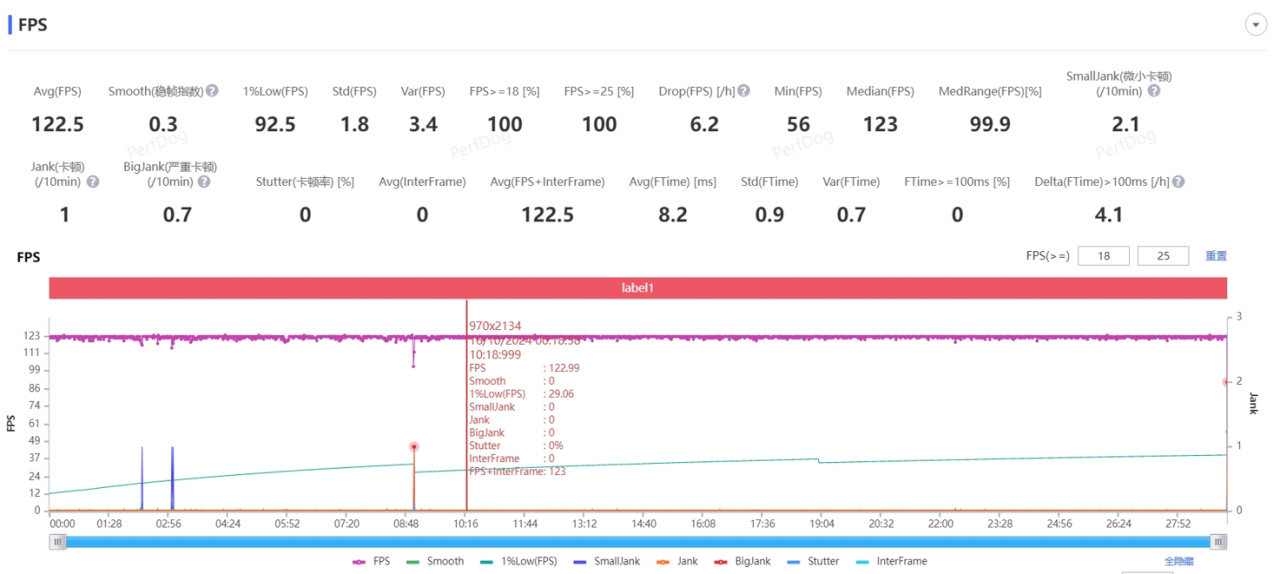 在連續30分鐘極致畫質+超高分辨率的10V10大亂鬥後,iQOO13最終的成績也是非常漂亮,最終平均幀數122.5幀,1%low也在90幀以上,在遊戲過程中沒有任何可感知的卡頓。