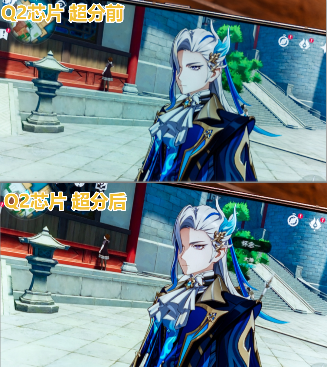 你讓我拉近了看,確實人物會更細膩一些,但在正常觀看距離下,尤其是在人物運動的操作場景中,Q2芯片超分帶來的提升真的很難明顯的感知出來。有時候我還要確認一下超分是不是在正常開啓。
