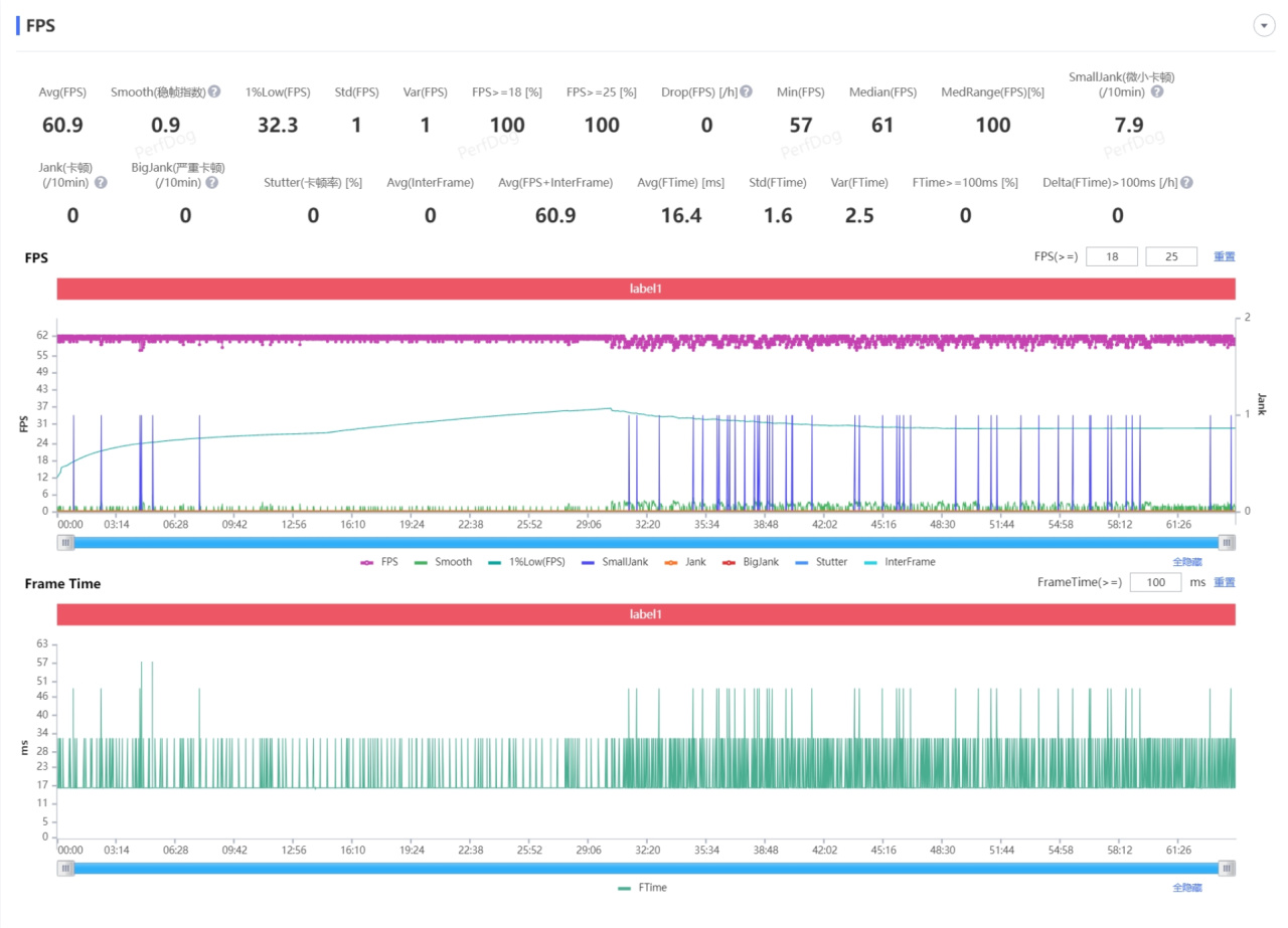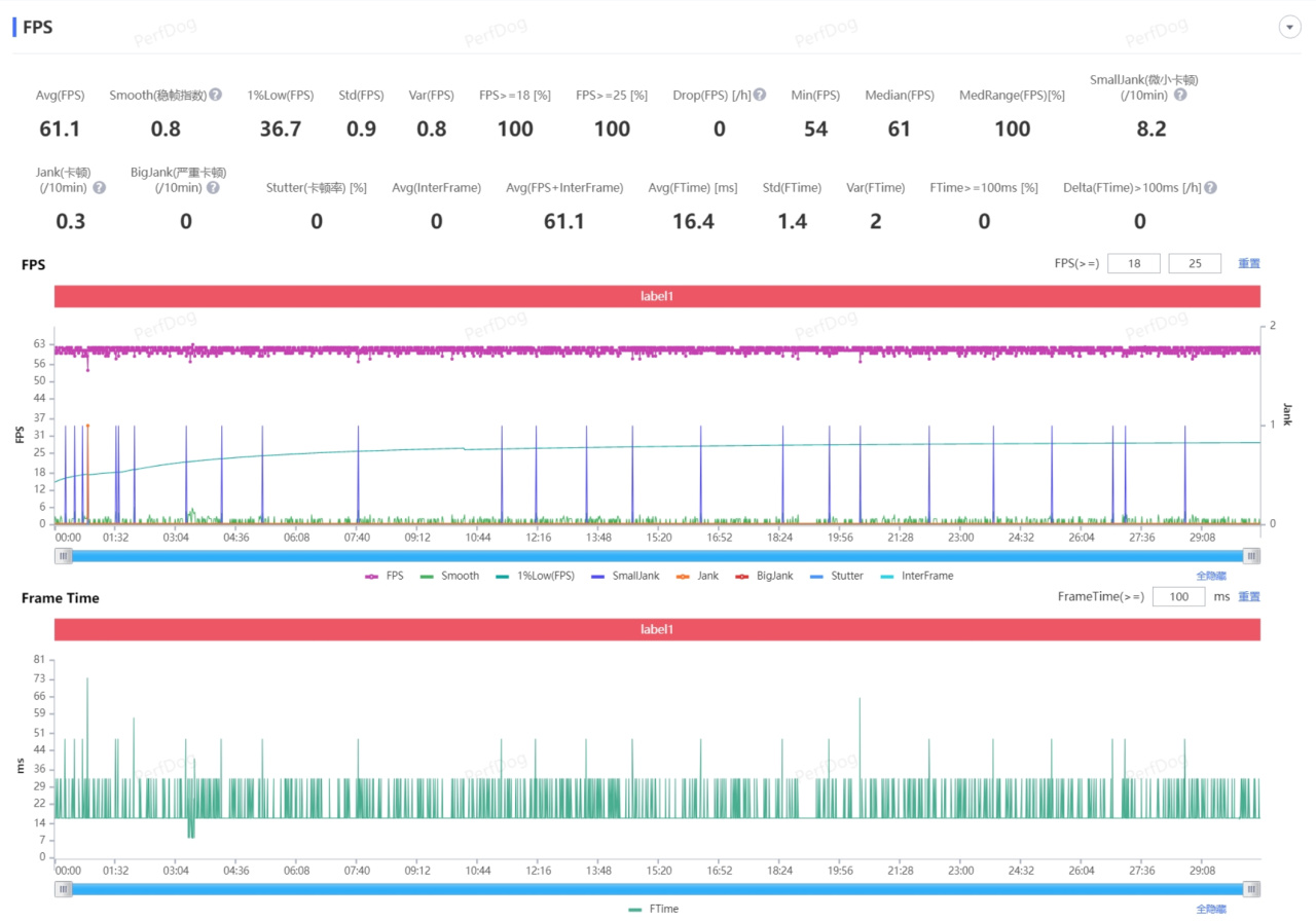 可以看到前30分鐘的幀率一直穩定在一條直線上,後半段跑圖+日常,幀率彩開始小幅波動,但平均幀依然來到了60.9幀,平均十分鐘微小卡頓只有7次。