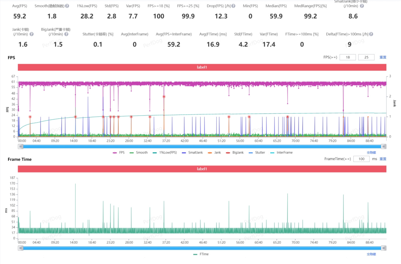 最後彙總數據,可以看出鳴潮的壓力確實不小,從一進遊戲就幀數就開始波動,中途甚至還有幾次大的掉幀。雖然最後平均幀依然達到了59.2幀,但整體的流暢度還是不如前面幾款遊戲的。
