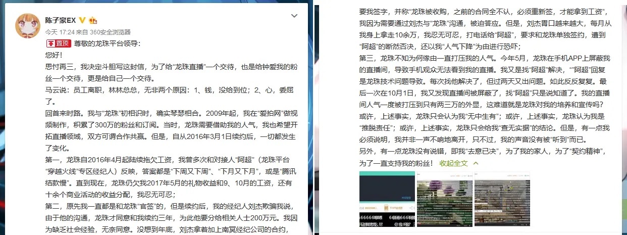 2017年9月LOL主播隔壁老王跳槽全民直播;10月CF主播陳子豪跳槽虎牙,併發文龍珠拖欠工資;2018年7月旭旭寶寶也跳槽去了鬥魚。
