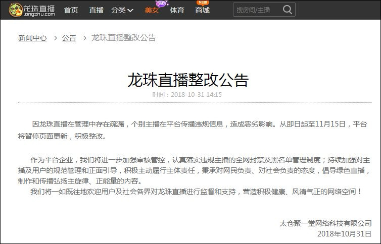 2018年10月,壓倒駱駝的最後一根稻草:龍珠直播六個主播傳播色情低俗內容導致多個部門聯合約談,並責令龍珠直播暫停更新15天。對於一個流量型平臺15天使足以決定生死的,自此龍珠在“千播大戰”中落敗。