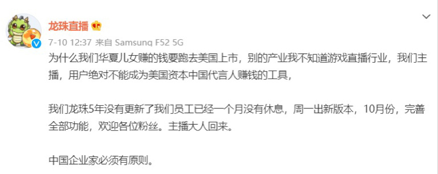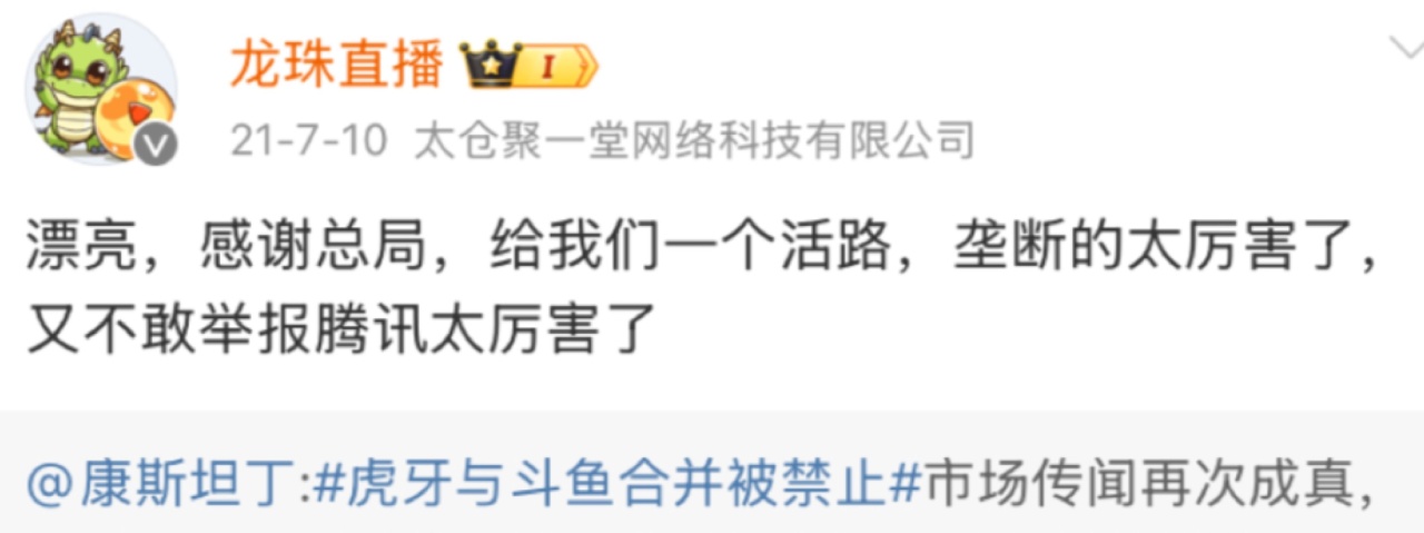 在2021年虎牙鬥魚合併被叫停,此時已經“涼透了”的龍珠官博來了次突然“詐屍”再次回到了大衆的眼前。