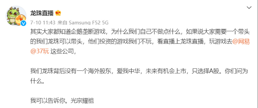 大多數博文都與企鵝有關,並且開始給自己包裝一個愛國形象。龍珠直播某種程度上來說也算是“光腳不怕穿鞋的”,畢竟之前已經被打壓這麼久,就算現在直接跳臉懟企鵝,情況也不會變得更糟糕。