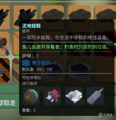 泥地蛙鞋,穿上後釣魚只會釣到垃圾。(前期應該能補補材料,但是解鎖等級又太靠後,雞肋,建議整蠱不看文本的隊友用)