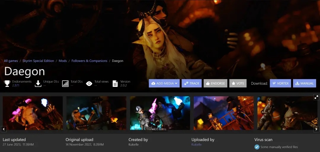 這位MOD製作者便是大名鼎鼎的“庫基爾(Kukielle)”,或許你覺得她的名字耳生,但你應該打過她製作的MOD。她製作的《上古卷軸5:天際》隨從MOD質量極高。其中,最受歡迎的是“黛宮和凱娜瑞絲”(音譯:Daegon和Kaeserius),這是兩個有着6000多句自定義語音臺詞且可以配合的隨從。