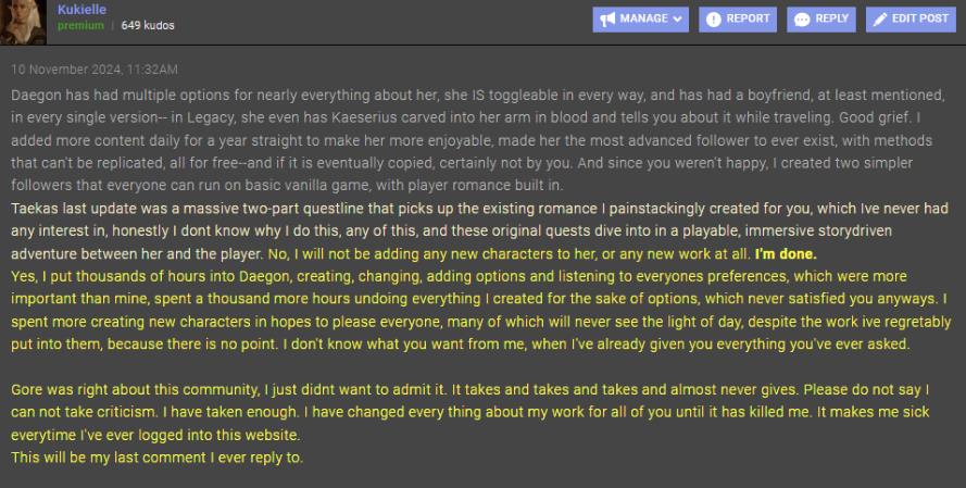 庫基爾在她帖子的結尾,提到了另一位MOD製作者戈爾德夫(Goredev)。戈爾德夫的隨從MOD也擁有超 130 萬次下載量,但他在經過 18 個月的MOD更新後,於 8 月退出了這個領域,據傳是因爲遭到了人肉。庫基爾說:“戈爾德夫對這個(玩家)羣體的看法是正確的…… 這個羣體一直在索取、索取、索取,卻幾乎從不給予回報。請不要說我聽不得批評,我已經聽夠了。我爲了你們所有人把我作品裏的所有東西都改了個遍,直到我心力交瘁。每次登錄這個網站都讓我噁心。這將是我回復的最後一條評論了。” 在她的 Discord 帖子中,庫基爾還聲稱,除了對她作品的批評之外,她的照片也在玩家羣體中被四處傳播,同時還伴有詆譭性的評論。