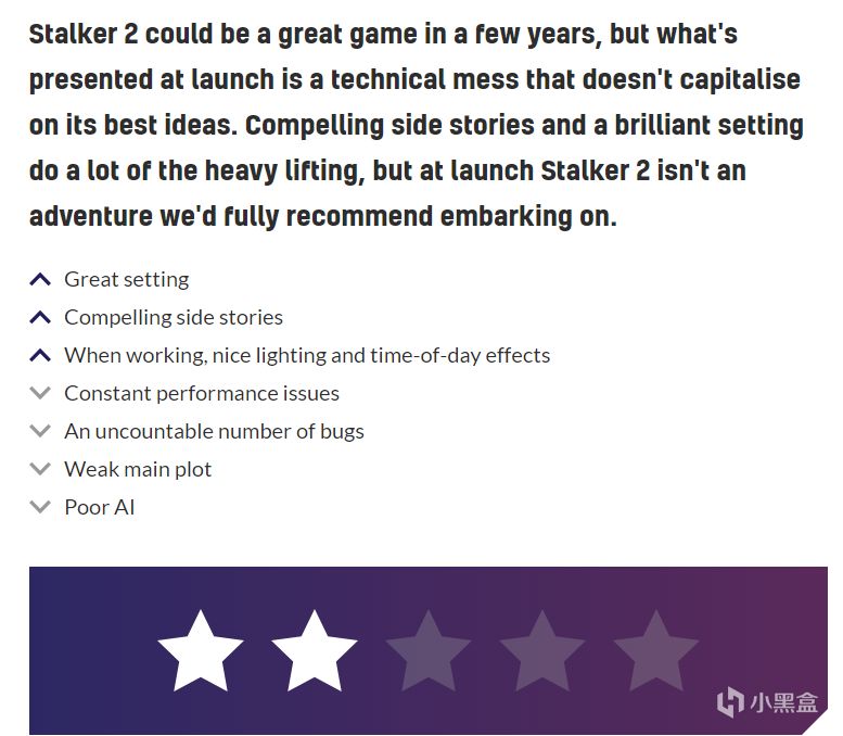 《潛行者2:切爾諾貝利之心》雖有成爲優秀遊戲的潛力,但發佈時的技術問題頻出,未能充分發揮其優勢。