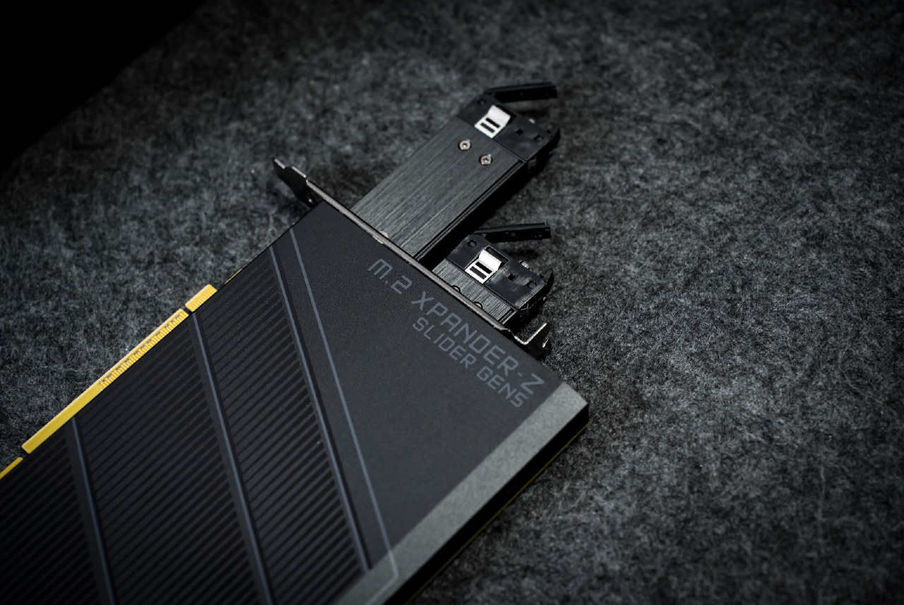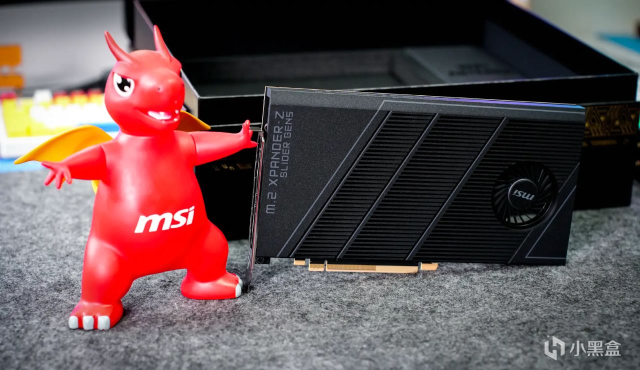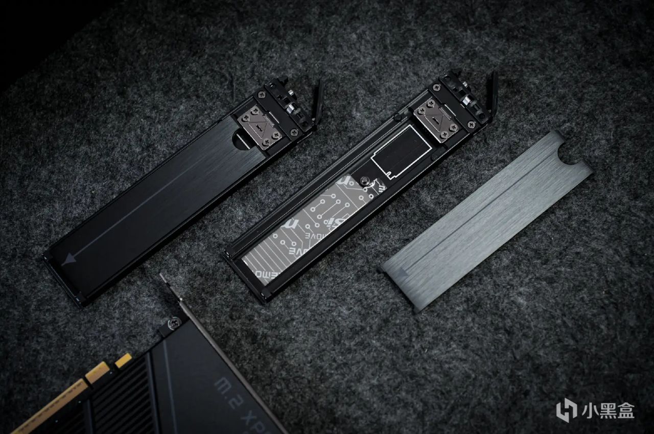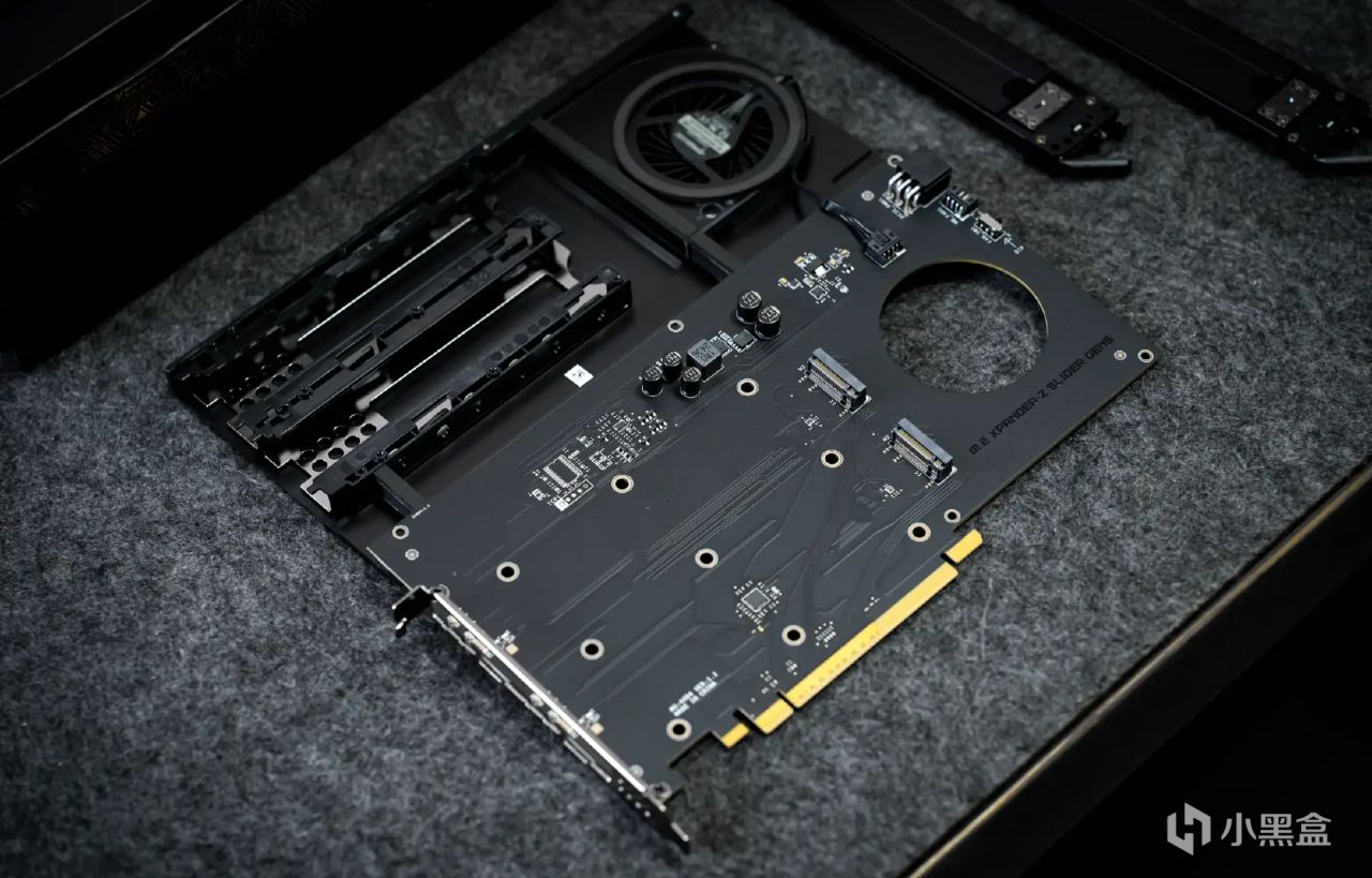 至於這個像顯卡一樣的大傢伙則是一個M.2固態拓展卡,該拓展卡採用PCIe5.0協議,搭載了2個M.2插槽,並且外部的散熱裝甲爲全金屬材質,內部還有風扇進行主動散熱。