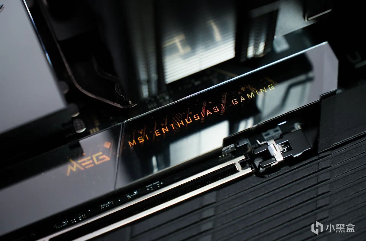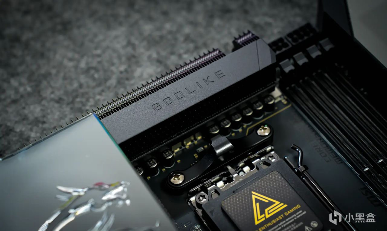 微星MEG X870E GODLIKE超神主板看上去的第一眼會讓人覺得眼前一亮,其主色調爲黑色,部分散熱裝甲都採用了磨砂鏡面設計,所以在未點亮的狀態下非常內斂,就如同一塊黑色的玉石,質感也是極爲出彩。