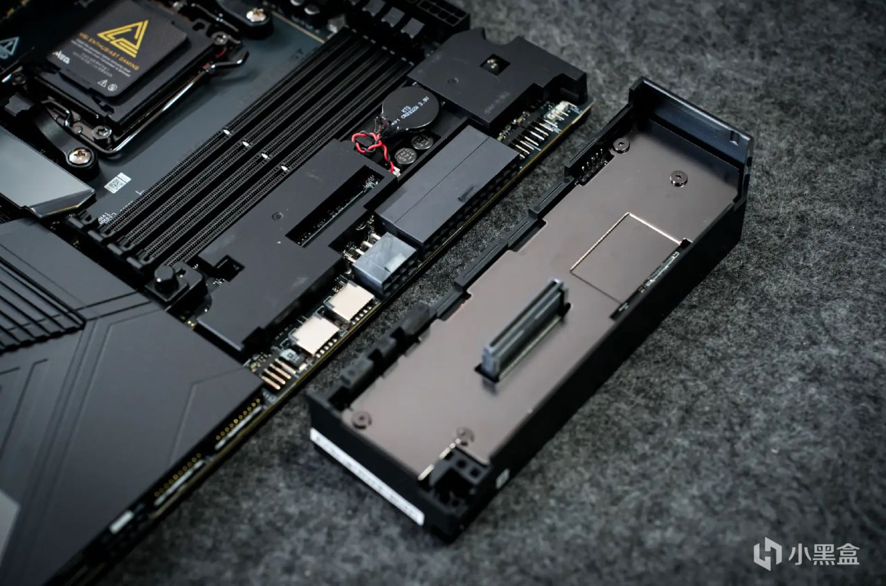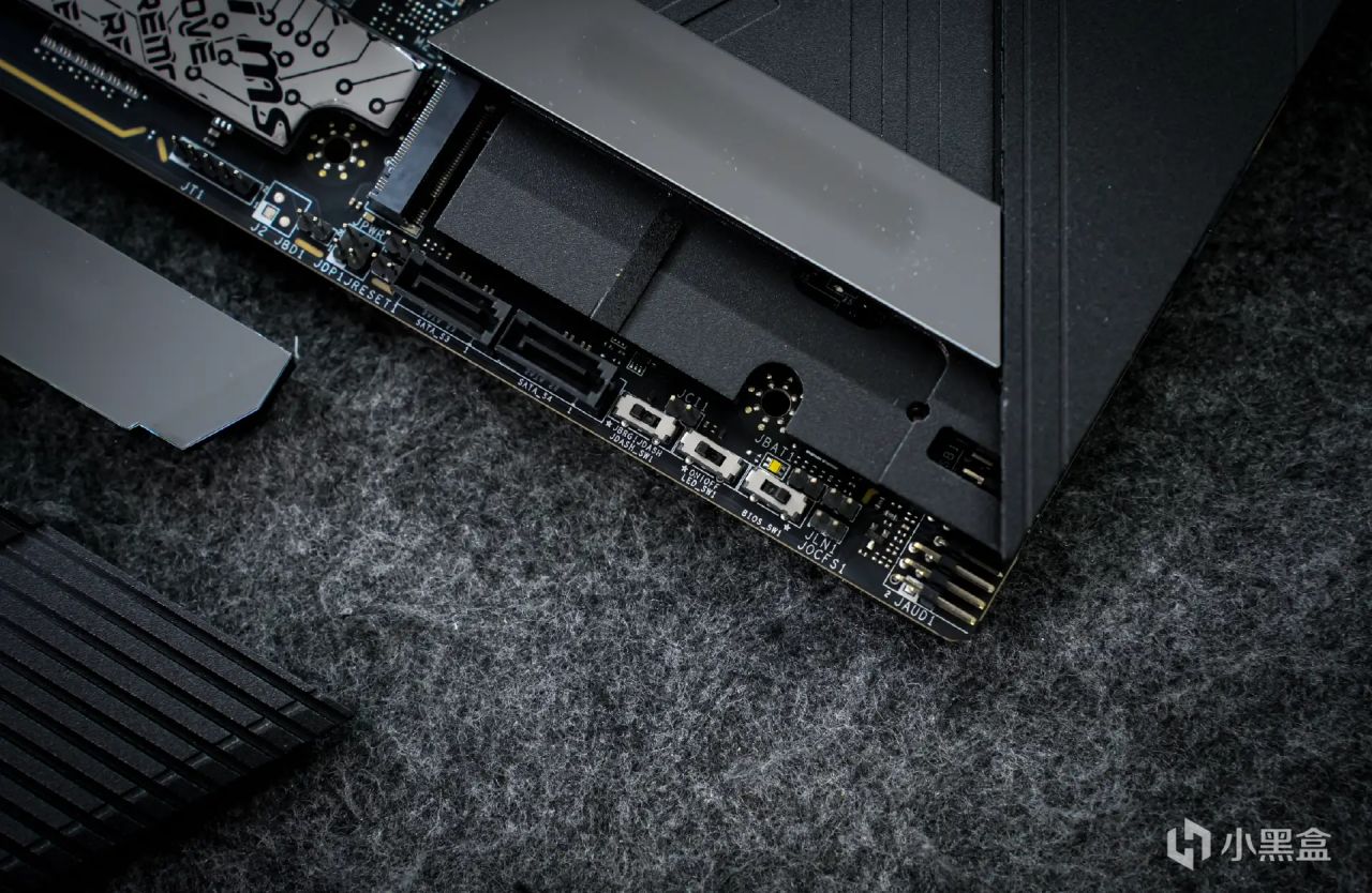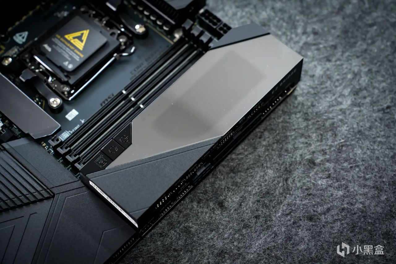 主板的右側還有2個SATA接口,用於用戶拓展傳統機械硬盤。不過爲了主板的整體美觀,微星的工程師還在散熱模組上設計了一個磁吸模塊用於遮擋。