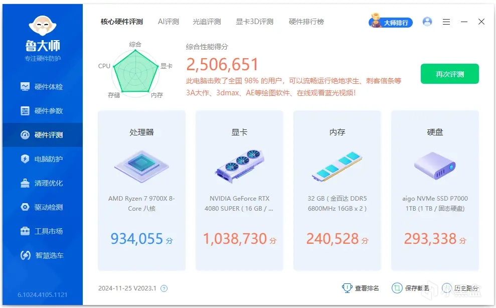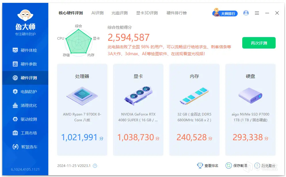 魯大師CPU性能測試也順利破百萬,達到了1021991。